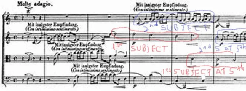 After a short introduction, at 10:34 (measure 169), marked "Mit innigster Empfindung" (with the deepest passion), at 10:52 (measure 172), the true nature of the quartet is revealed to us. We referenced Beethoven's double-fugal method vis a vis the motif pairs in Movements I and II. It is a method, rather than a formality, but at 10:52 "A" and "B" enter into a formal double fugue together. THE ENTIRE QUARTET IS PART OF BEETHOVEN'S DOUBLE FUGAL METHOD, which we have seen in so many other of his last great works, such as The “Grosse Fuge”, the “Ninth Symphony”, and the “Missa Solemnis”.