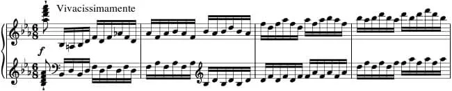 The strings, representing the Furies, enter with "Ha! Who dares approach this place?" They sing in octaves, and in harsh declamatory terms. The piano represents Orpheus with his lyre, and sings beautifully in 4-voiced harmony, but “una corda” (using only one string per note, which gives it a very gentle and warm singing tone):